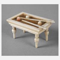 um 1900, ungemarkt, Bein geschnitzt bzw. gedrechselt und partiell farbig gefasst, samtbezogener Billardtisch mit drei Kugeln und zwei Queues, leichte Altersspuren, L 5 cm.