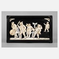 Ende 19. Jh., Elfenbein beschnitzt, auf geschwärzter Holzplatte montiert, humorvolle Darstellung vier lustiger Gesellen, welche den Groll eines Wirtes auf sich gezogen haben, rückseitig schwer leserlich bezeichnet, min. Altersspuren, Maße 38 x 23,5 cm.