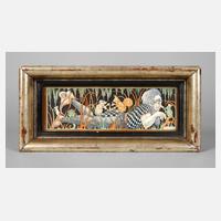 um 1915, signiert Piwonka, Elfenbein feinst beschnitzt, graviert und mehrfarbig gefasst, Darstellung eines im Unterholz bäuchlings liegenden Kobolds, auf dessen Hinterteil ein Maulwurf und ein Eichhörnchen vergnügt Schach spielen, zudem tummeln sich weitere Tiergestalten wie ein bekröntes Fröschlein, ein Mäuschen und eine Schnecke um den lustigen Gesellen, hinter Glas in vergoldeter Holzleiste gerahmt, IM 8 x 23,5 cm.