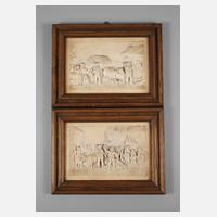 um 1900, eines sign. C. F. Becker, Kunstgussplatten mit bäuerlichen Szenen bei der Heuernte sowie beim Schlachtfest, in schlichten Nussbaumleisten gerahmt, gegilbt, kleinere Fehlstellen, IM je 16 x 23 cm.
