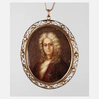 hochovales Kopfbildnis eines vornehmen Herrn in barocker Tracht mit ordengeschmückter Brust und grauer Allongeperücke, wohl Darstellung des Hans Georg von Ribbeck auf Ribbeck im Havelland (1689–1759), welcher 1889 durch Theodor Fontane (1819–1898) in seiner Ballade ”Herr von Ribbeck auf Ribbeck im Havelland” – besser bekannt als ”Gedicht vom Birnbaum” – ein literarisches Denkmal gesetzt bekam, fein mit spitzem Pinsel festgehaltene Miniaturmalerei, Öl auf Bein, 2. Hälfte 19. Jh., unsigniert, restauriert, rückseitig schwer lesbares Ligaturmonogramm ”KOR” in Metallfadenstickerei auf Seide, beidseitig verglast und im durchbrochen gearbeiteten und mit Perlen verzierten Messingrahmen mit Kette gefasst, Provenienz laut Vorbesitzerangabe: Familie von Ribbeck, Maße ca. 5,9 x 5 cm.