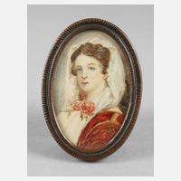 2. Hälfte 19. Jh., unsigniert, Gouache auf Elfenbein, Schulterstück einer jungen Dame mit rosengeschmücktem Tuch, in zartem Messingrahmen gefasst, L 8 cm.