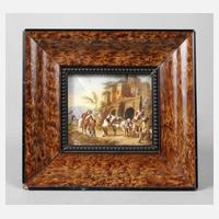 19. Jh., links unten in Rot bezeichnet n. Naumann, Gouache auf Elfenbein, wohl Kopie nach Carl Georg Naumann (1827–1902), Genreszene in südlicher Landschaft mit edlem Recken und einfachem Volk vor Architekturkulisse, Trocknungsriss, hinter Glas in moderner Leiste gerahmt, IM 6 x 7 cm.