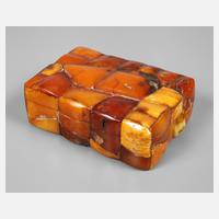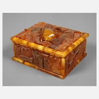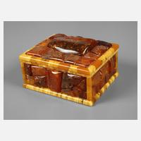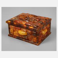 2. Hälfte 20. Jh., Holzkorpus, belegt mit verschiedenfarbigen, teils naturbelassenen Bernsteinen, auf Deckel Bernstein von 4,6 x 7,7 cm Größe, Höhe 7,3 cm, Breite 11,7 cm, Tiefe 9,5 cm.