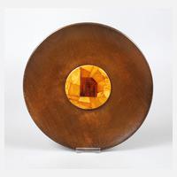 Mitte 20. Jh., flach gedrechselte Schale mit Bernsteinmosaik und eingravierter Ansicht von St. Marien in Danzig, Mosaik minimal bestoßen, Schalendurchmesser ca. 29,5 cm.