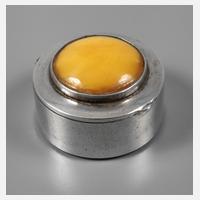 1. Hälfte 20. Jh., Silber gestempelt 800 und Herstellerpunze, Deckel besetzt mit runder Bernsteincabochon in Zargenfassung, Durchmesser der Dose 30 mm, Gewicht ca. 13,8 g.