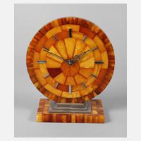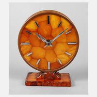 wohl Staatliche Bernsteinmanufaktur Königsberg, um 1930, rundes Nussbaumgehäuse, das Ziffernblatt aus karamellfarbenen Bernsteinblättchen, Zahlen und Zeiger vernickelt, Sockel und Werk ergänzt, Sockelkante mit Fehlstelle, Funktion nicht geprüft, H 19 cm.