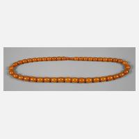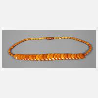 1. Hälfte 20. Jh., im Mittelteil Scheiben von max. 20 mm Durchmesser, seitlich Bernsteinoliven von ca. 8 mm Länge, Schraubverschluss defekt, Länge 51 cm, Gewicht ca. 25,6 g.