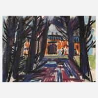 Blick zwischen Bäumen hindurch auf Gebäude mit Tordurchfahrt, expressive Mischtechnik (Kohle, Bleistift und Pastellkreide), um 1950, rechts unten in Blei sternförmig ligiert monogrammiert ”AW”, geringe Altersspuren, ungerahmt, Blattmaß ca. 17 x 23 cm. Künstlerinfo: dt. Maler, Zeichner und Graphiker (1894 Arnstadt bis 1970 Gera), ab 1908 in Gera, hier kaufmännische Lehre, 1913–18 Wehr- und anschließend Kriegsdienst, während des Kriegsdienstes in Frankreich Hinwendung zur Malerei, 1919–30 kaufmännische Tätigkeit als Schokoladengroßhändler in Gera und parallel intensive, autodidaktische Beschäftigung mit Malerei, unternahm Studienreise nach Frankreich, beeinflusst von seinem Schwager Otto Dix sowie Alfred Ahner und Kurt Günther, Mitglied der spätdadaistischen Vereinigung ”pro pro bru (produktive-prominente-brummochsen)”, ab 1930 freischaffend als Maler, Mitglied im Reichsverband Bildender Künstler Deutschlands und im Thüringer Ausstellerverband Bildender Künstler, 1942–45 Kriegsdienst, 1945 Initiator der Künstlergilde Gera und bis 1950 deren Leiter, Mitglied im Verband Bildender Künstler (VBK) der DDR, hier zeitweise Jury- und Vorstandsmitglied im Bezirk Gera, 1961 Ehrung mit dem Kunstpreis der Stadt Gera, tätig in Gera-Untermhaus, Quelle: Dressler, Vollmer, Eisold ”Künstler in der DDR” und Internetseite der Stadt Gera.