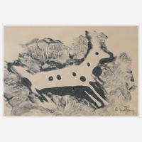 abstrahierte Darstellung eines Fuchses, expressive Monotypie, um 1930, rechts unten in Blei signiert ”A. Wolfgang”, rückseitig und auf dem Unterlagekarton betitelt ”Walderlebnis” und nummeriert 14, geringe Alters- und Montierungsspuren, im Passepartout ungerahmt, Passepartoutausschnitt ca. 19,5 x 28,5 cm. Künstlerinfo: dt. Maler, Zeichner und Graphiker (1894 Arnstadt bis 1970 Gera), ab 1908 in Gera, hier kaufmännische Lehre, 1913–18 Wehr- und anschließend Kriegsdienst, während des Kriegsdienstes in Frankreich Hinwendung zur Malerei, 1919–30 kaufmännische Tätigkeit als Schokoladengroßhändler in Gera und parallel intensive, autodidaktische Beschäftigung mit Malerei, unternahm Studienreise nach Frankreich, beeinflusst von seinem Schwager Otto Dix sowie Alfred Ahner und Kurt Günther, Mitglied der spätdadaistischen Vereinigung ”pro pro bru (produktive-prominente-brummochsen)”, ab 1930 freischaffend als Maler, Mitglied im Reichsverband Bildender Künstler Deutschlands und im Thüringer Ausstellerverband Bildender Künstler, 1942–45 Kriegsdienst, 1945 Initiator der Künstlergilde Gera und bis 1950 deren Leiter, Mitglied im Verband Bildender Künstler (VBK) der DDR, hier zeitweise Jury- und Vorstandsmitglied im Bezirk Gera, 1961 Ehrung mit dem Kunstpreis der Stadt Gera, tätig in Gera-Untermhaus, Quelle: Dressler, Vollmer, Eisold ”Künstler in der DDR” und Internetseite der Stadt Gera.
