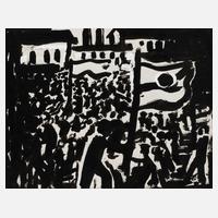 Menschenauflauf vorm Fabrikgebäude mit DDR-Fahne, expressive Tuschpinselzeichnung in schwarz, partiell mit Korrekturen in weißer Gouache, um 1960, rechts unten in der Darstellung in Tusche sternförmig ligiert monogrammiert ”AW”, rückseitig in Blei betitelt ”Fahnenträger in der Masse” und weitere Annotationen, geringe Altersspuren, ungerahmt, Blattmaß ca. 27 x 34,5 cm. Künstlerinfo: dt. Maler, Zeichner und Graphiker (1894 Arnstadt bis 1970 Gera), ab 1908 in Gera, hier kaufmännische Lehre, 1913–18 Wehr- und anschließend Kriegsdienst, während des Kriegsdienstes in Frankreich Hinwendung zur Malerei, 1919–30 kaufmännische Tätigkeit als Schokoladengroßhändler in Gera und parallel intensive, autodidaktische Beschäftigung mit Malerei, unternahm Studienreise nach Frankreich, beeinflusst von seinem Schwager Otto Dix sowie Alfred Ahner und Kurt Günther, Mitglied der spätdadaistischen Vereinigung ”pro pro bru (produktive-prominente-brummochsen)”, ab 1930 freischaffend als Maler, Mitglied im Reichsverband Bildender Künstler Deutschlands und im Thüringer Ausstellerverband Bildender Künstler, 1942–45 Kriegsdienst, 1945 Initiator der Künstlergilde Gera und bis 1950 deren Leiter, Mitglied im Verband Bildender Künstler (VBK) der DDR, hier zeitweise Jury- und Vorstandsmitglied im Bezirk Gera, 1961 Ehrung mit dem Kunstpreis der Stadt Gera, tätig in Gera-Untermhaus, Quelle: Dressler, Vollmer, Eisold ”Künstler in der DDR” und Internetseite der Stadt Gera.