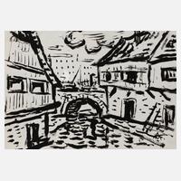 Partie aus der Altstadt von Gera, expressive Tuschpinselzeichnung in schwarz, partiell mit Korrekturen in weißer Gouache, um 1960, rechts unten in der Darstellung in Tusche sternförmig ligiert monogrammiert ”AW”, rückseitig Montierungsspuren, geringe Altersspuren, ungerahmt, Blattmaß ca. 30 x 42 cm. Künstlerinfo: dt. Maler, Zeichner und Graphiker (1894 Arnstadt bis 1970 Gera), ab 1908 in Gera, hier kaufmännische Lehre, 1913–18 Wehr- und anschließend Kriegsdienst, während des Kriegsdienstes in Frankreich Hinwendung zur Malerei, 1919–30 kaufmännische Tätigkeit als Schokoladengroßhändler in Gera und parallel intensive, autodidaktische Beschäftigung mit Malerei, unternahm Studienreise nach Frankreich, beeinflusst von seinem Schwager Otto Dix sowie Alfred Ahner und Kurt Günther, Mitglied der spätdadaistischen Vereinigung ”pro pro bru (produktive-prominente-brummochsen)”, ab 1930 freischaffend als Maler, Mitglied im Reichsverband Bildender Künstler Deutschlands und im Thüringer Ausstellerverband Bildender Künstler, 1942–45 Kriegsdienst, 1945 Initiator der Künstlergilde Gera und bis 1950 deren Leiter, Mitglied im Verband Bildender Künstler (VBK) der DDR, hier zeitweise Jury- und Vorstandsmitglied im Bezirk Gera, 1961 Ehrung mit dem Kunstpreis der Stadt Gera, tätig in Gera-Untermhaus, Quelle: Dressler, Vollmer, Eisold ”Künstler in der DDR” und Internetseite der Stadt Gera.