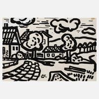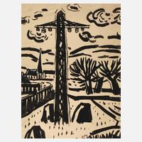 abstrahierte Landschaft mit Stromleitungsmast vorm Dorf mit Kirche, expressive Tuschpinselzeichnung in schwarz, partiell mit Korrekturen in weißer Gouache, um 1950, auf Karton aufgezogen, hier links unten in Blei betitelt ”Landschaft” und rechts signiert ”A. Wolfgang”, Altersspuren, ungerahmt, Blattmaß ca. 34,5 x 26,5 cm, Künstlerinfo: dt. Maler, Zeichner und Graphiker (1894 Arnstadt bis 1970 Gera), ab 1908 in Gera, hier kaufmännische Lehre, 1913–18 Wehr- und anschließend Kriegsdienst, während des Kriegsdienstes in Frankreich Hinwendung zur Malerei, 1919–30 kaufmännische Tätigkeit als Schokoladengroßhändler in Gera und parallel intensive, autodidaktische Beschäftigung mit Malerei, unternahm Studienreise nach Frankreich, beeinflusst von seinem Schwager Otto Dix sowie Alfred Ahner und Kurt Günther, Mitglied der spätdadaistischen Vereinigung ”pro pro bru (produktive-prominente-brummochsen)”, ab 1930 freischaffend als Maler, Mitglied im Reichsverband Bildender Künstler Deutschlands und im Thüringer Ausstellerverband Bildender Künstler, 1942–45 Kriegsdienst, 1945 Initiator der Künstlergilde Gera und bis 1950 deren Leiter, Mitglied im Verband Bildender Künstler (VBK) der DDR, hier zeitweise Jury- und Vorstandsmitglied im Bezirk Gera, 1961 Ehrung mit dem Kunstpreis der Stadt Gera, tätig in Gera-Untermhaus, Quelle: Dressler, Vollmer, Eisold ”Künstler in der DDR” und Internetseite der Stadt Gera.