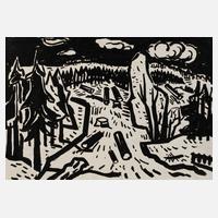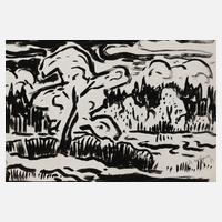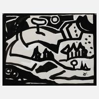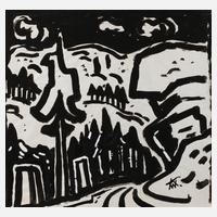 abstrahierte Bauernhofdarstellung mit Bäuerin vorm Weidegatter mit Rind, expressive Monotypie, um 1930, links unten in der Darstellung sternförmig ligiert monogrammiert ”AW” und mit Blei nummeriert 12, rückseitig und auf dem Unterlagekarton betitelt ”Am Futterplatz” und nummeriert 15, geringe Alters- und Montierungsspuren, im Passepartout ungerahmt, Passepartoutausschnitt ca. 19,5 x 28,5 cm. Künstlerinfo: dt. Maler, Zeichner und Graphiker (1894 Arnstadt bis 1970 Gera), ab 1908 in Gera, hier kaufmännische Lehre, 1913–18 Wehr- und anschließend Kriegsdienst, während des Kriegsdienstes in Frankreich Hinwendung zur Malerei, 1919–30 kaufmännische Tätigkeit als Schokoladengroßhändler in Gera und parallel intensive, autodidaktische Beschäftigung mit Malerei, unternahm Studienreise nach Frankreich, beeinflusst von seinem Schwager Otto Dix sowie Alfred Ahner und Kurt Günther, Mitglied der spätdadaistischen Vereinigung ”pro pro bru (produktive-prominente-brummochsen)”, ab 1930 freischaffend als Maler, Mitglied im Reichsverband Bildender Künstler Deutschlands und im Thüringer Ausstellerverband Bildender Künstler, 1942–45 Kriegsdienst, 1945 Initiator der Künstlergilde Gera und bis 1950 deren Leiter, Mitglied im Verband Bildender Künstler (VBK) der DDR, hier zeitweise Jury- und Vorstandsmitglied im Bezirk Gera, 1961 Ehrung mit dem Kunstpreis der Stadt Gera, tätig in Gera-Untermhaus, Quelle: Dressler, Vollmer, Eisold ”Künstler in der DDR” und Internetseite der Stadt Gera.