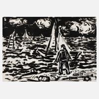Mann am Strand, vor weiter See mit Booten, unter bewölktem Himmel, expressive Tuschpinselzeichnung in schwarz, partiell mit Korrekturen in weißer Gouache, um 1960, rechts unten in der Darstellung in Tusche sternförmig ligiert monogrammiert ”AW”, geringe Altersspuren, ungerahmt, Blattmaß ca. 29,5 x 42 cm. Künstlerinfo: dt. Maler, Zeichner und Graphiker (1894 Arnstadt bis 1970 Gera), ab 1908 in Gera, hier kaufmännische Lehre, 1913–18 Wehr- und anschließend Kriegsdienst, während des Kriegsdienstes in Frankreich Hinwendung zur Malerei, 1919–30 kaufmännische Tätigkeit als Schokoladengroßhändler in Gera und parallel intensive, autodidaktische Beschäftigung mit Malerei, unternahm Studienreise nach Frankreich, beeinflusst von seinem Schwager Otto Dix sowie Alfred Ahner und Kurt Günther, Mitglied der spätdadaistischen Vereinigung ”pro pro bru (produktive-prominente-brummochsen)”, ab 1930 freischaffend als Maler, Mitglied im Reichsverband Bildender Künstler Deutschlands und im Thüringer Ausstellerverband Bildender Künstler, 1942–45 Kriegsdienst, 1945 Initiator der Künstlergilde Gera und bis 1950 deren Leiter, Mitglied im Verband Bildender Künstler (VBK) der DDR, hier zeitweise Jury- und Vorstandsmitglied im Bezirk Gera, 1961 Ehrung mit dem Kunstpreis der Stadt Gera, tätig in Gera-Untermhaus, Quelle: Dressler, Vollmer, Eisold ”Künstler in der DDR” und Internetseite der Stadt Gera.