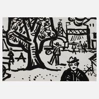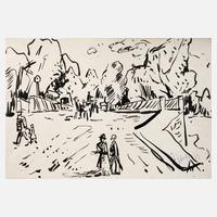 expressive Straßenszene, Tuschpinselzeichnung in schwarz, partiell mit Korrekturen in weißer Gouache, um 1960, rechts unten in der Darstellung in Tusche sternförmig ligiert monogrammiert ”AW”, geringe Altersspuren, ungerahmt, Blattmaß ca. 27 x 39 cm. Künstlerinfo: dt. Maler, Zeichner und Graphiker (1894 Arnstadt bis 1970 Gera), ab 1908 in Gera, hier kaufmännische Lehre, 1913–18 Wehr- und anschließend Kriegsdienst, während des Kriegsdienstes in Frankreich Hinwendung zur Malerei, 1919–30 kaufmännische Tätigkeit als Schokoladengroßhändler in Gera und parallel intensive, autodidaktische Beschäftigung mit Malerei, unternahm Studienreise nach Frankreich, beeinflusst von seinem Schwager Otto Dix sowie Alfred Ahner und Kurt Günther, Mitglied der spätdadaistischen Vereinigung ”pro pro bru (produktive-prominente-brummochsen)”, ab 1930 freischaffend als Maler, Mitglied im Reichsverband Bildender Künstler Deutschlands und im Thüringer Ausstellerverband Bildender Künstler, 1942–45 Kriegsdienst, 1945 Initiator der Künstlergilde Gera und bis 1950 deren Leiter, Mitglied im Verband Bildender Künstler (VBK) der DDR, hier zeitweise Jury- und Vorstandsmitglied im Bezirk Gera, 1961 Ehrung mit dem Kunstpreis der Stadt Gera, tätig in Gera-Untermhaus, Quelle: Dressler, Vollmer, Eisold ”Künstler in der DDR” und Internetseite der Stadt Gera.