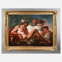 kontemplative Szene mit Darstellung eines alten grauhaarigen, nackten Mannes unter Weinreben, neben drei jungen Burschen in lichter Landschaft schlummernd, wohl Kopie nach älterem Vorbild, minimal pastose, allegorische Genremalerei mit schönem Licht und kraftvoller Farbigkeit, Öl auf Leinwand, Mitte 19. Jahrhundert, unsigniert, wachsdoubliert und restauriert, Craquelure, gering reinigungsbedürftig, original im prächtigen, ca. 11,5 cm breiten Goldstuckrahmen mit erneuerter Vergoldung gerahmt, Falzmaß 101 x 140 cm.