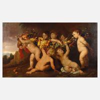 herbstliche Landschaft mit nackten Putti, einen prächtigen Früchtekranz tragend, dekorative, lasierende Kopie nach dem bekannten, um 1615 entstandenen Gemälde der Alten Pinakothek München, welches Peter Paul Rubens (1577–1640) in Zusammenarbeit mit Frans Snyders (1579–1657) schuf, Öl auf Leinwand, um 1950, in Goldstuckleiste gerahmt, Falzmaß 56,5 x 94,5 cm.