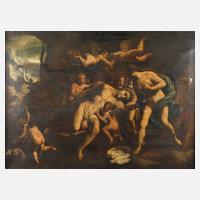 die griechische Mythologie berichtet von Adonis, dem Gott der Vegetation und der Schönheit als einem ungewöhnlich schönen als auch stolzen Jüngling, welcher der Jagdleidenschaft frönte, er wuchs in der Obhut der Göttinnen Persephone und Aphrodite auf, die beide dem Knaben verfallen waren und ihn zum Liebhaber begehrten, Gottvater Zeus entschied, dass Adonis je ein Drittel seiner Zeit den Göttinnen widmen solle und ein Drittel zur freien Verfügung habe, Adonis entschied sich für Aphrodite, die durch einen Pfeil ihres Sohnes Eros heftig in Liebe und Sorge um Adonis entbrannt war, sie warnte den Heißsporn vor gefährlicher Jagd auf wilde Tiere, ungeachtet dieser Warnung setzte der Jüngling einem wilden Eber in seiner Höhle nach, um ihn zu erlegen – nicht ahnend, dass sich in Gestalt des Ebers der Gott des Krieges und des Massakers, Ares, verbarg, welcher Aphrodite ebenfalls begehrte, Ares verletzte Adonis tödlich, Aphrodite vernahm die Klagelaute Adonis´ und eilte auf ihrem Wagen zu ihrem Geliebten in die Höhle, die Darstellung der Aphrodite als auch des Adonis diente im prüden Barock als trefflicher Vorwand der Verbildlichung von Liebenden und Nacktheit, so offenbart sich dem Betrachter im Zentrum des Geschehens mit dem sterbenden Adonis ein makelloser Jünglingsakt und auch die rechts ihrem Wagen entsteigende Aphrodite ist nahezu unbekleidet, im Vordergrund symbolisieren zwei turtelnde Tauben das Verhältnis der beiden Hauptpersonen als Liebespaar, nackte Amoretten umsorgen den Körper des Adonis und gießen aus einer Kanne Nektar auf seine Wunde, der sich mit dem Blut des Sterbenden vermischte und nach dem Willen der Aphrodite zur Erinnerung an die Schönheit, als auch deren Kurzlebigkeit, in Adonisröschen verwandelte, links verprügelt Eros mit seinem Bogen einen an der Kette liegenden Jagdhund des Adonis als Strafe für die Ignoranz von Aphrodites Warnung, darüber ist der davon preschende Eber in gebirgiger Phantasielandschaft mit herrschaftlichem Palast dargestellt, fein ausgeführte, allegorische Genremalerei, Öl auf Leinwand, wohl 17. Jh., rechts unten Signaturreste, randdoubliert, Fehlstellen in der Leinwand teils alt hinterlegt, alt restauriert, restaurierungsbedürftig, gerahmt, Falzmaß ca. 66,5 x 90 cm.