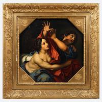 biblische Szene des Alten Testamentes (1. Buch Mose, 39) mit der attraktiven Frau des Potiphars (Kämmerer des ägyptischen Pharaos), die dessen keuschen Diener Josef begehrte, aus Rache um die Zurückweisung Josefs, bezichtigt Potiphars Frau Josef bei ihrem Mann der Vergewaltigung, woraufhin dieser Josef ins Gefängnis warf, wohl Öldruck auf Papier und Leinwand, um 1880 nach dem um 1680 entstandenen Gemälde von Carlo Cignani (1628–1719), das heute in der Galerie ”Alte Meister” in Dresden verwahrt wird, unsigniert, Erhaltungsmängel, original im aufwendigen, quadratischen Goldstuckrahmen um 1880 mit oktogonalem Bildausschnitt gerahmt (geringe Erhaltungsmängel), Falzmaß ca. 34 x 34 cm.