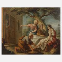 alttestamentarische Szene, an einem Tisch im Freien haben sich unter einem mächtigen Laubbaum zwei von Gott gesandte Engel mit ihren Reisebündeln niedergelassen, Lot bewirtet sie und wäscht seinen Gästen nach altem jüdischen Brauch die Füße, neben den Fremden steht eine der Töchter Lots und weist auf ihre Schwester, die gerade die Tür ihres Hauses öffnet, hierzu vermerkt das erste Buch Mose (Genesis 19,1–2) ”Die zwei Engel kamen nach Sodom am Abend; Lot aber saß zu Sodom unter dem Tor. Und als er sie sah, stand er auf, ging ihnen entgegen und neigte sich bis zur Erde und sprach: Siehe, liebe Herren, kehrt doch ein im Hause eures Knechts und bleibt über Nacht; lasst eure Füße waschen und brecht frühmorgens auf und zieht eure Straße.”, minimal pastose, religiöse Genremalerei, Öl auf Leinwand, 18. Jh., unsigniert, doubliert, alt restauriert, im Goldstuckrahmen gerahmt, Falzmaß ca. 47 x 58 cm.