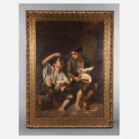 zwei ärmlich gekleidete Straßenjungen beim Trauben bzw. Melone essen, fein lasierende, teils minimal pastose Kopie nach dem berühmten, zwischen 1645 und 1655 entstandenen, Gemälde der Alten Pinakothek München von Bartolomé Esteban Murillo (1618–1682), Öl auf Leinwand, links unten bezeichnet ”Murillo 1304 (Inventarnummer) Pinakothek München”, und rechts unten signiert und datiert ”Hans Blum München 1893”, rückseitig Rahmungsetikett ”Albert Suckow Berlin ...”, Quadrierung durchscheinend, minimal restaurierungsbedürftig, original im prächtigen, ca. 14,5 cm breiten Goldstuckrahmen gerahmt, Falzmaß: 142 x 100 cm. Künstlerinfo: dt. Maler und Aquarellist (1858 Nürnberg-Doos bis 1942 München), studierte ab 1873 an der Kunstgewerbeschule Nürnberg bei Karl Raupp, Carl Jäger, Friedrich Wanderer und Konradin Walther, ab 1876 Studium an der Akademie München bei Wilhelm von Lindenschmidt dem Jüngeren und Ludwig von Löfftz, 1884 Rückkehr nach Nürnberg, ab 1890 wieder in München, 1891–1919 als Professor an der Kunstgewerbeschule tätig, beschickte die Ausstellungen des Münchner Glaspalastes und Berliner Ausstellungen, Mitglied der Münchner Künstlergenossenschaft, tätig in München, Quelle: AKL, Vollmer, Thieme-Becker, Boetticher, Dressler und Matrikel der Münchner Akademie.