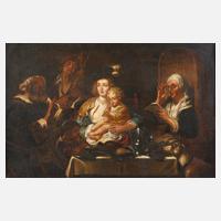 Blick in einen dämmrigen Raum, mit um einen festlich gedeckten Tisch versammelter Familie beim Singen und Musizieren, fein ausgeführte, freie, barocke Kopie nach dem 1638 entstandenen allegorischen Gemälde ”Wie die Alten sungen so pfeifen auch die Jungen” von Jacob Jordaens (1593 Antwerpen bis 1678 Antwerpen), das heute im Königlichen Museum der Schönen Künste Antwerpen verwahrt wird, Öl auf Leinwand, 18. Jh., unsigniert, wachsdoubliert, restauriert, gering restaurierungsbedürftig, gerahmt, Falzmaß 39 x 58,5 cm.