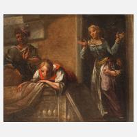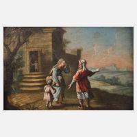 Szene des Alten Testaments, die Bibel (Genesis. 1. Buch Mose, 16 und 21) berichtet von dem Paar Abraham und Sara, die ungewollt kinderlos blieben, darauf drängt Sara ihren Mann, mit ihrer ägyptischen Haussklavin Hagar ein Kind zu zeugen, welches als ihr Stammhalter gelten solle, Hagar gebar Ismael, als dieser 14 Jahre alt war, gebar Sara wider Erwarten ihren Sohn Isaak, worauf sie Abraham überzeugte, Hagar und Ismael des Hauses zu verweisen, Öl auf Holz, wohl 2. Hälfte 18. Jh., unsigniert, Malgrund verzogen, rückseitig neuzeitliche Annotation in Blei ”Christian Brand”, in alter, holzwurmstichiger Leiste gerahmt, Falzmaß ca. 13 x 20 cm.