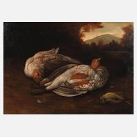 zwei erlegte Rebhühner, neben Grünfink, vor herbstlicher Gebirgslandschaft, fein lasierende, stimmungsvolle Genremalerei in der Art von Johann Georg Waxschlunger (1690–1737), Öl auf Leinwand, 18. Jh., unsigniert, restauriert und wachsdoubliert, gerahmt, Falzmaß 42 x 57 cm.