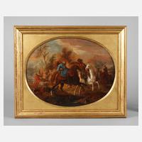 dramatische Kriegsszene mit Reitern im Nahkampf, wohl Szene aus dem Österreichischen Erbfolgekrieg (1740–1748), ovale, fein mit spitzem Pinsel lasierend festgehaltene barocke Historienmalerei, Öl auf Leinwand und Holz, unsigniert, restauriert, hinter vergoldetem ovalen Passepartout gerahmt, Falzmaß ca. 23 x 29,5 cm.