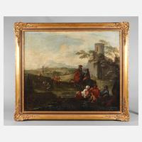 Darstellung des Lagerlebens des 17./18. Jh. in sommerlicher Landschaft, im Vordergrund ruhende und Pfeife rauchende Männer, sich mit einer jungen Frau unterhaltend, im Mittelgrund aufbrechende Reiter vor Festungsbauwerk, im Hintergrund sind zahlreiche Soldaten und Zelte angedeutet, Öl auf Leinwand, wohl 17./18. Jh., unsigniert, Craquelure, wachsdoubliert, alt ausgebessert, restaurierungsbedürftig, im neuzeitlichem Goldstuckrahmen gerahmt, Falzmaß ca. 92 x 79 cm.