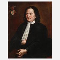 Halbfigurenbildnis eines würdevollen Mannes mit Perücke, im schwarzen Talar mit weißem Mühlsteinkragen in der Amtsmode des 17./18. Jahrhunderts, lasierende, partiell minimal pastose Malerei, Öl auf Leinwand, unsigniert, doubliert, gering restauriert, Craquelure mit Farbaufschüsselung, gering restaurierungsbedürftig, im prächtigen, ca. 14 cm breiten Goldstuckrahmen gerahmt, Falzmaß 77 x 61 cm.