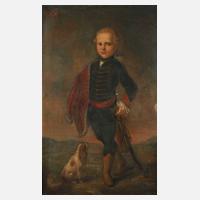 herrschaftliches Ganzfigurenbildnis des späteren königlich-preußischen Kammerherrn Johann Carl Gottlob von Nostitz und Jänkendorf, als Knabe in Uniform mit Cavalier King Charles Spaniel in abendlicher Landschaft, links oben prächtiges, von zwei Greifen gehaltenes Wappen derer von Nostitz mit den Initialen und Geburtsdatum des Dargestellten ”C. G. v. N. u. J. nat: 1754”, fein lasierende Kopie nach dem barocken Original von ca. 1760, Öl auf Leinwand, rückseitig auf der Leinwand betitelt ”Johann Carl Gottlob von Nostitz und Jänckendorf aus dem Hause Wiesa – geb.: zu Wiesa den 9. September 1754, † daselbst am 30. Januar 1839” sowie signiert und datiert ”Gustav Müller – Inspector der Königl. Gemäldegalerie pinxit Dresden 1907”, Craquelure, gering farbschwundrissig, minimal restaurierungsbedürftig, gerahmt, Falzmaß ca. 119 x 79 cm. Künstlerinfo: eigentlich Gustav Otto Müller, Maler, Kopist, Kustos und Kunstschriftsteller (1827 Dresden bis 1922 Dresden), studierte 1842–46 an der Akademie Dresden bei Ernst Friedrich August Rietschel, Julius Schnorr von Carolsfeld und kurzzeitig bei Julius Hübner, ab 1865 Zeichenlehrer am königlichen Kadettenhaus Dresden und vorwiegend als Militärmaler tätig, ab 1870 Inspektor und schließlich 1908–10 Kustos der Königlichen Gemäldegalerie zu Dresden, Freundschaft zu Karl May, tätig in Dresden, Quelle: Thieme-Becker, Boetticher, Müller-Singer und Karl-May-Wiki.
