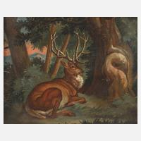 abendliche Sommerlandschaft mit ruhendem Hirsch am Waldrand, lasierende, partiell minimal pastose Tiermalerei, frei nach einem Gemälde von Johann Elias Ridinger (1698–1767), Öl auf Holz 19. Jh., unsigniert, Malgrund holzwurmstichig, gerahmt, Falzmaß ca. 25 x 30 cm.
