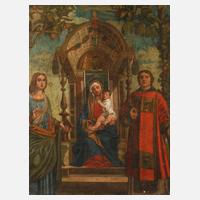 Darstellung Mariens mit Christus, unter einem Baldachin in Paradiesgartenlandschaft, je links und rechts von Heiligen flankiert, minimal pastose, religiöse Genremalerei, Öl auf Leinwand und Keilrahmen, um 1800, unsigniert, doubliert, Craquelure, alt restauriert, gering restaurierungsbedürftig, ungerahmt, Maße 92 x 69,5 cm.