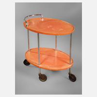 deutsch, 1930er Jahre, Gestell aus verchromtem Stahlrohr, ovale Platte aus Schichtholz orangerot lackiert, auf Rädern gelagert, Originallack etwas verblasst, Platte mit Flecken, Maße 73 x 68 x 45 cm.