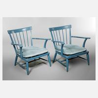 1940er Jahre, Zarge mit Firmenetikett Knoll Antimott DRP, Buchenholz massiv, später blau gefasst, die Rückenlehne aus Bambusstäben, Sitzfläche mit patentierten, stoffummantelten Spiralfedern, Bezüge der Polsterauflage erneuert, 76 x 72 x 73 cm.