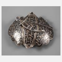 um 1900, Silber geprüft, Ornamentmuster in Niellotechnik, teilweise ziseliert und versehen mit Schriftzug „Kaukasus“, Verschluss als Türkensäbel an Kette, rückseitig zahlreiche Punzen, Breite 70 mm, Gewicht ca. 35,1 g.
