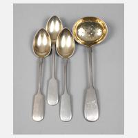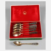 Anfang 20. Jh., gestempelt 84 Zolotniki, Kopfmarke nach rechts, Hersteller kyrillisch bez. IU, vergoldete Laffen, rückseitig feine florale Gravur, Teesieb mit Besitzermonogramm CM?, L max. 16 cm, G ca. 125 g.