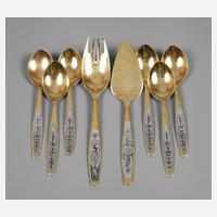 2. Hälfte 20. Jh., sechs Speiselöffel und zwei Vorlegeteile, gestempelt Hammer und Sichel im Stern 875, teilvergoldet, beidseitig geschwärzte Blütenmotive, L max. 22 cm, G zusammen ca. 382 g.