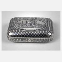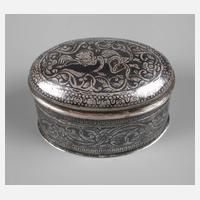 1. Hälfte 20. Jh., Silber geprüft, ovale Dose mit abnehmbarem Deckel, geschwärzt, reicher Dekor aus Rollwerk und Blüten mit umlaufenden Ornamentbordüren, auf dem Deckel ein stilisiertes Engelsmotiv, am Boden korrespondierende Gravur, L 5,5 cm, G ca. 29 g.