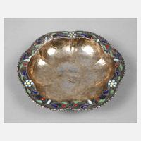 wohl Persien, 1. Hälfte 20. Jh., gestempelt 1000, Silber geprüft, fein getrieben auf drei angedeuteten, hohl gearbeiteten Standfüßen, der geschweifte Rand mit aufgelegten Kordelbändern und opakem buntem Emaille, stilisierte Blütenranken, normale Altersspuren, D 9,5 cm, G ca. 28 g.