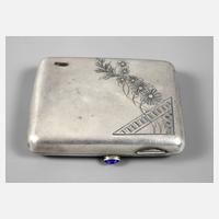 um 1920, Silber gest. 84 Zolotniki sowie BAK, scharniertes Gehäuse mit floral grav. Front, Öffnung mittels Druckknopf, dieser besetzt mit blauem Glascabochon, Innenleben aus grüner Kunstseide mit drei Fächern, dieses alt rep., Altersspuren, Maße 8 x 6,5 cm.