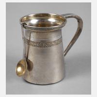 1. Hälfte 20. Jh., Silber innen mit Resten alter Vergoldung, gestempelt 84 Zolotniki, unleserliche Herstellermarke, umlaufend reliefierte Ornamentbänder, geschweifter Bandhenkel, dazu ein Löffelchen, H 6 cm, G ca. 67 g.