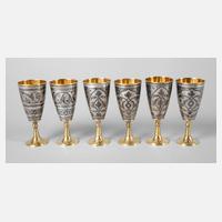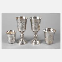 zwei gefußte um 1882, gestempelt 84 Zolotniki bzw. 13 Lot, unleserliche Herstellermarke, mit ornamentaler Gravur, dazu zwei kleine konische Becher, datiert 1887 und 1891, beide Moskau mit Stadtmarke Georg der Drachentöter, Beschaumeister B.C und L.O, kyrillische Meistermarken PD und MG, H max. 10 cm, G zusammen ca. 132 g.