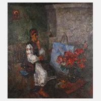 sitzendes Mädchen an der Staffelei im dämmrigen Interieur, stark pastose Malerei mit breitem Pinselduktus in dunkeltoniger Farbigkeit, Öl auf Leinwand und partiell applizierte goldfarbene Metallfolie, rückseitig in kyrillischer Schrift signiert ”V. Yevmenenko” bzw. ”W. Evmenenko”, weiterhin Angabe des Geburtsjahres 1958, datiert 1988 und betitelt ”Maria Bilokur”, Fehlstellen in der Leinwand, restaurierungsbedürftig, schlicht gerahmt, Falzmaß 110 x 102 cm.