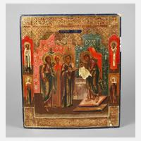 Russland, um 1890, Tempera auf zweifach gesperrter Laubholzplatte (Rückseitensponki fehlen), partiell ornamental punziert und vergoldet, kirchenslawisch bezeichnet, Darstellung des Heiligen Josef, Annas und Mariens im Tempel, die den Christusknaben in die Hände des greisen Simeon geben, flankiert von vier Randheiligen, min. retuschiert, partielle Substanzverluste, beigegeben Expertise des Ikonenmuseums Schloss Autenried bei Günzburg/Donau, Maße 32 x 27 cm.