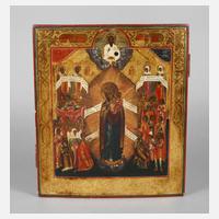 Russland, Ende 19. Jh., kirchenslawisch betit., Tempera über Kreidegrund, auf leicht gewölbter einfacher Laubholzplatte mit zwei Rückseitensponki, goldbronziert, minimaler Kovtscheg, Darstellung Mariens als Zentralfigur auf flachem Podest, umgeben von üppiger Aureole, den Kopf geneigt, die Arme weit ausgebreitet, flankiert von mehreren, von Engeln begleiteten Hilfesuchenden sowie vier oberhalb platzierten Heiligenfiguren, bekrönt von Darstellung Christus Pantokrator auf Wolkensockel, partiell retuschiert, kleinere oberflächliche Substanzverluste, Maße 36 x 31 cm.