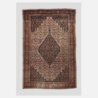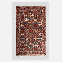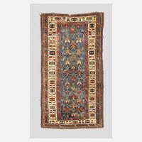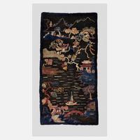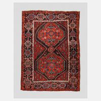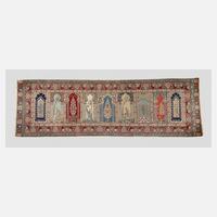 Mitte 20. Jh., in intensiver Farbigkeit, schachbrettartig gegliedertes Mittelfeld mit Tier-, Landschafts- und Floraldarstellungen, mehrteilige umlaufende Bordüren mit Blütendarstellungen, Fransenbesatz einseitig gekürzt, gute Erhaltung mit leichten Gebrauchsspuren, Maße 306 x 208 cm.