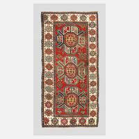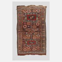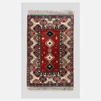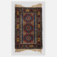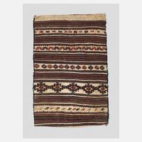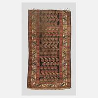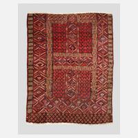 Mitte 20. Jh., in intensiver, vorwiegend roter Farbigkeit, typisches Kreuzmotiv mit geometrischer Bordüre und unterem Abschluss mit Sternmotiven, Fransenbesatz gekürzt, Maße 136 x 119 cm.